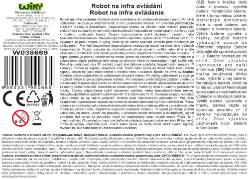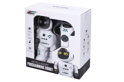 Robot RC na dálkové ovládání. Rozměry 13,2x10,5x26,3 cm. Infračervený port. Ovládání dotykem, pohybem ruky a ovladačem. Světelné a zvukové efekty. Funkce - podsvícený obličej (mění výraz), pohyb hlavy, ovládání pohybem ruky, ovládání dotykem, programování, demo režim, zvuky, hudba, nastavení hlasitosti. 3.7V 500mAh bateriový pak do robota součástí, 2xAAA do ovladače nejsou součástí. USB kabel součástí. Tlačítko ON/OFF na hrudi robota.