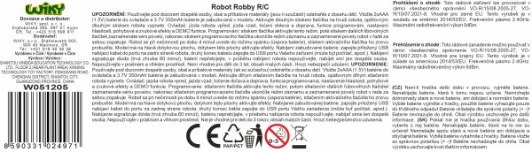 Robot Robby RC na dálkové ovládání. Rozměry 13x9x15 cm. Frekvence 2.4GHz. Světelné a zvukové efekty. Bateriový pack 3.7V 350mAh Lithium do robota součástí, 2xAAA do ovladače nejsou součástí. USB kabel součástí. Ovladač - pohyb dopředu a dozadu, otáčení vlevo a vpravo, tanec, programování, ovládání hlasitosti, demo režim, zvukové efekty (hudba).