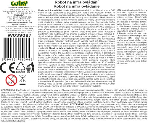 Robot se 6 nohama RC na dálkové ovládání. Rozměry 15x15x18 cm. Infračervený port. Světelné a zvukové efekty. Funkce - podsvětlený obličej (různé výrazy), programování, chůze, tanec, hudba. 3xAA baterie do robota, 2xAAA do ovladače nejsou součástí.