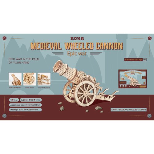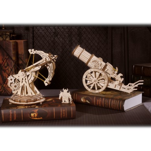 Staňte se slavnými dobyvateli prostřednictvím řady mechanických skládaček obléhacích strojů Robotime. Zakuste výzvu při jejich stavbě, procvičujte logiku i zručnost, a s pomocí hotových modelů pak uspořádejte ty nejpamátnější bitvy! Skvělý dárek pro všechny fanoušky válečných her, vojenství a historie! Obléhací kanón se může pyšnit mnoha atraktivními detaily věrně odrážejícími středověké zbraně. Jeho rozměrná hlaveň je přizpůsobena ke střelbě pingpongových míčků, což z něj dělá zvláště univerzální hračku. Mechanismus střelby je ručně natahován a je opatřen spouští, úhel odpalu je možno volně nastavit. Díky velkým kolům lze kanón snadno přemístit, a přizpůsobit tak situaci na bojišti. Skládačka je dodávána v nesloženém stavu, balena v krabici. Vybaveno detailním návodem k sestavení. Hlavní vlastnosti:158 precizně vyřezaných dílkůstřední obtížnost sestavenívýsledný model je schopen střelby pingpongových míčků