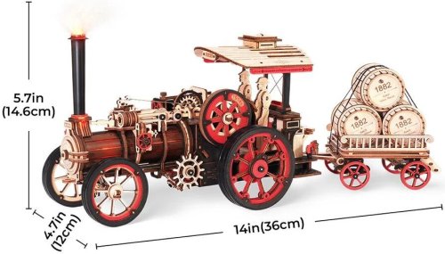 Skládačka parního stroje řady ROBOTIME ROKR prověří Vaše konstruktérské dovednosti.