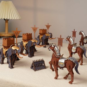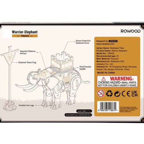 Vojsko je shromážděno a připraveno k boji! Tato dřevěná 3D skládačka slona Vám přinese spoustu zábavy při stavění a hraní. Přední končetiny slona jsou pohyblivé a dají se ohnout. Obličej, hřbet a břicho jsou pokryty zlatým brněním, které poskytuje všestrannou ochranu. Břišní část zbroje je navíc opatřena stylovými kovovými přezkami. Kromě samotného koně je součástí této skládačky také totemová bojová vlajka. Skládačka je dodávána v nesloženém stavu, balena v krabici. Vybaveno detailním návodem k sestavení. Výborně se doplňuje s Bojovým koněm (kód TWA01), Bojovným lvem (TWA03), Vlkem bojovníkem (TWA04). S nimi bude armáda neporazitelná! Případně mohou změřit své síly mezi sebou! Hlavní vlastnosti: skládačka slona a vlajky kožené zlaté brněnípohyblivé končetiny