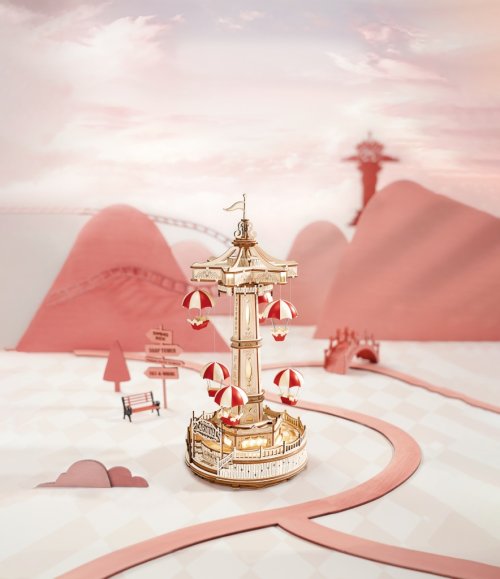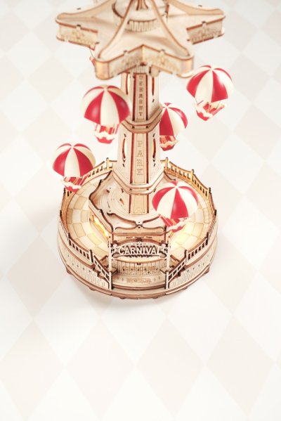 Designér se nechal inspirovat klasickou atrakcí padákové věže ve skutečném zábavním parku a upravil ji tak, že zvedání padáku probíhá stupňovitě nahoru a dolů. Šestiúhelníková základna kopíruje tvar stropu a boční okna jsou vyrobena z průsvitných materiálů, která mohou propouštět teplé světlo a poskytují plný pocit atmosféry. Celkem jsou zde tři světla. Kolotoč je poháněn bateriově napájeným (baterie nejsou součástí balení) motorkem a osvětlen pomocí LED. Dotekovým ovládáním lze zvlášť kontrolovat jeho pohyb a zvuk. Dodáváno v nesloženém stavu, baleno v krabici spolu s detailním návodem k sestavení. Hlavní vlastnosti: romantická melodie Falling Flower motorový pohon, LED osvětlení (3×AAA baterie nejsou součástí balení)184 precizně vyřezaných dílkůtěžká obtížnost sestavení