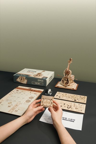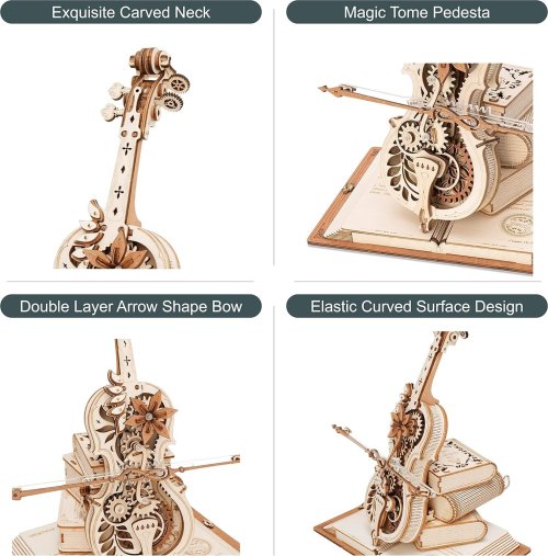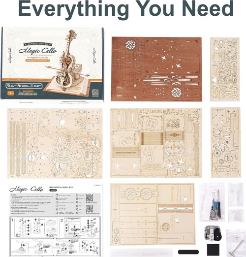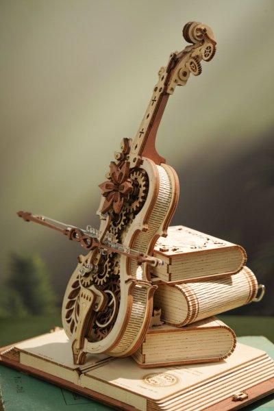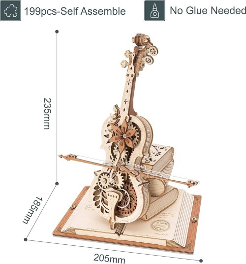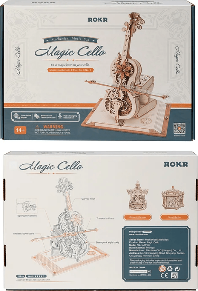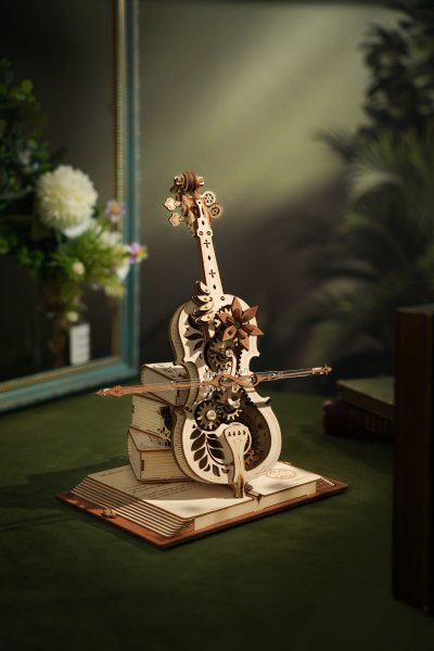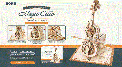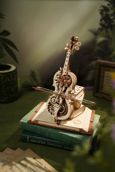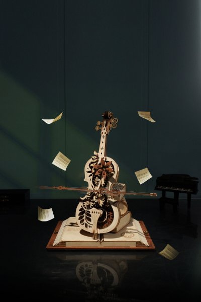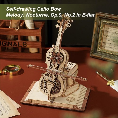 Kouzlo mechanických převodů - vnitřní převodová soustava je ozdobena šestilistým květem. Základnu tvoří otevřená kniha otce violoncella Pabla Casalse. Zmenšený hmatník. Dekorace s klasickým evropským vzorem s množstvím tajemných prvků (kouzelné knihy, magické čarodějnice a kočky). Hrací skříňka na klíček s melodií: Nocturno Es, Op. 9 č. 2. Laserem předřezané dílky z kvalitní lipové překližky pro stavbu svépomocí, lepidlo není potřeba. Rozvíjí technické myšlení, představivost, cit pro detail a jemnou motoriku. Přehledný obrázkový návod krok za krokem, včetně QR kódů pro zobrazení videa.