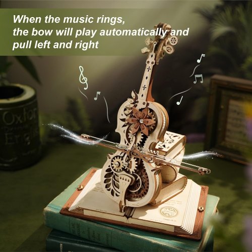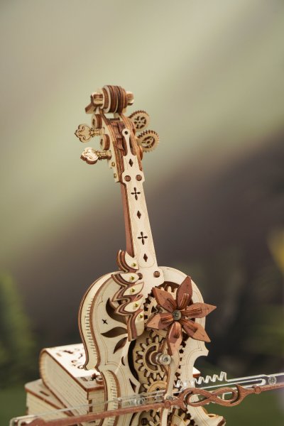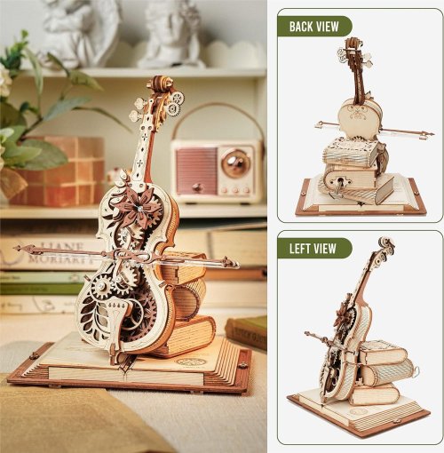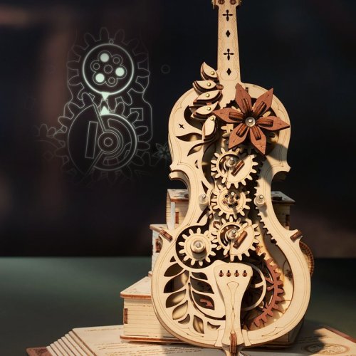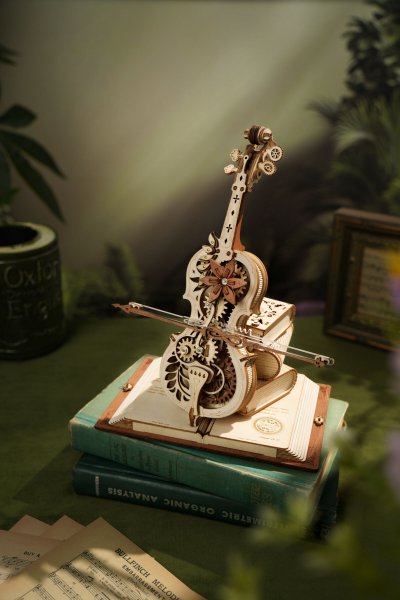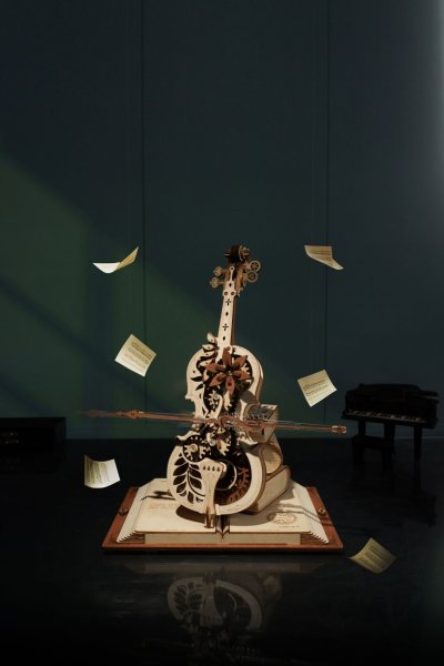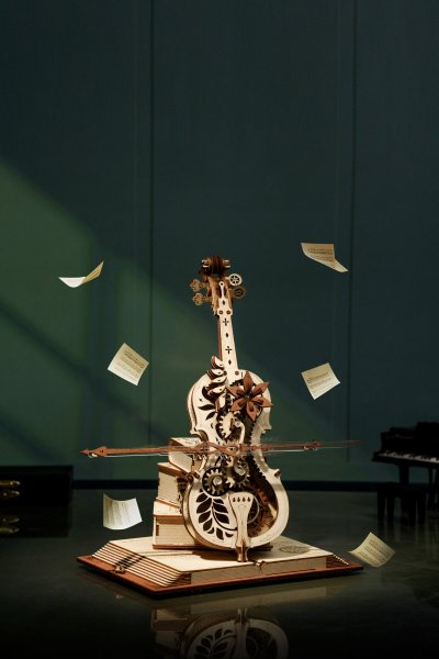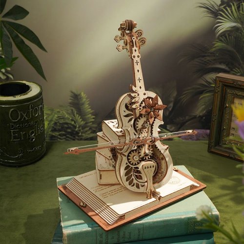 3D dřevěný mechanický model - kouzelná hrací skříňka na klíček ve tvaru kouzelného violoncella s pohybujícím se smyčcem.