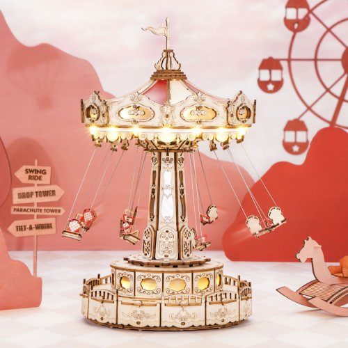 Atraktivně dekorovaný model klasického řetízkového kolotoče přehráváním romantické melodie vykouzlí neopakovatelnou atmosféru. Je poháněn bateriově napájeným (baterie nejsou součástí balení) motorkem a osvětlen pomocí LED. Dotekovým ovládáním lze zvlášť kontrolovat jeho pohyb a zvuk. Dodáváno v nesloženém stavu, baleno v krabici spolu s detailním návodem k sestavení. Skládačky hracích skříněk Robotime jsou nabízeny v mnoha podobách, přírodních i barevných, lišících se nápaditými pohyblivými detaily doprovázejícími zvuk. Nezaskočí Vás svou náročností a po sestavení zkrášlí poličku. Nechejte se unášet známými melodiemi, každá skříňka hraje jinou, odpovídající své výsledné podobě. Hlavní vlastnosti: romantická melodie Merry Go Roundmotorový pohon, LED osvětlení (3×AAA baterie nejsou součástí balení)289 precizně vyřezaných dílkůstřední obtížnost sestavení