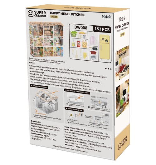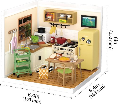 Promyšlený pracovní stůl, otevíratelná dvířka skříněk a úložné prostory odpovídají praktickým požadavkům na vaření. Nechybí ani mini mikrovlnka a hluboký zvětšený dřez. Unikátní kombinace trouby a varné desky, realistický steak, jemný smaltovaný hrnec a velká lednice s otevíratelnými dvířky podtrhují důraz na detail, který tato kuchyňská miniatura nabízí. Různé předpřipravené potravinové miniatury navíc přidávají zábavu při stavění.