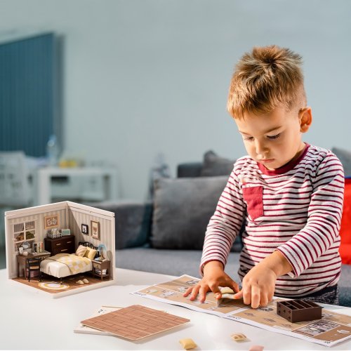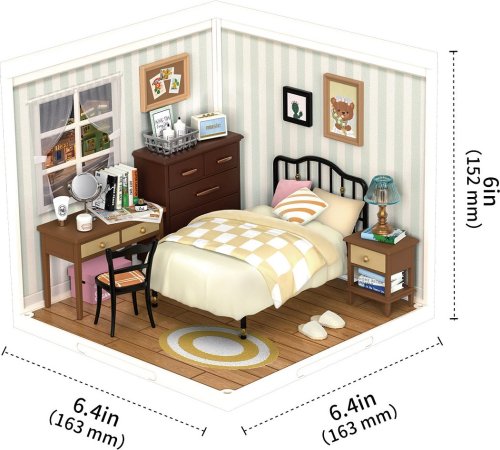Rolife Sweet Dream Bedroom Miniature House představuje klasické uspořádání typického každodenního spacího prostoru s uklidňujícími tóny přírodního dřeva a krémově žluté barvy. Tento design vytváří prostředí, které podporuje snadnou relaxaci a klidný spánek. Miniaturka ložnice obsahuje různé dekorativní předměty a barevné ilustrace, které zdobí teplou a elegantní ložnici. Spací zónu tvoří postel v iron stylu s odnímatelným povlečením, doplněná o noční stolek s praktickými zásuvkami. V šatní části je malý otočný zrcadlo o 360 stupňů a na straně vintage židle je prostorná úložná krabice, která poskytuje všestranný prostor pro úpravy. Nejvíce pohlcujícím prvkem v místnosti jsou otevřitelné zásuvky skříněk, které vám umožní organizovat drobné předměty a personalizovat tuto útulnou ložnici při sestavování.