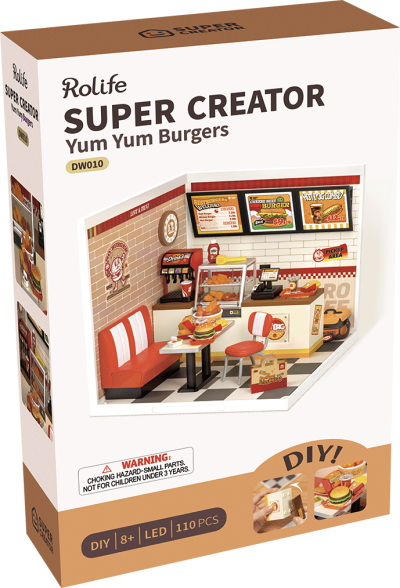 Vychutnejte si jeho zářivé barvy a vklouzněte do retro stánku, kde si můžete pochutnat na maličkých hamburgerech, hranolkách, kuřecím mase, koblihách a dalších chutných nabídkách podávaných přímo u vašeho stolu. Požádejte o doplnění limonády, zatímco budete bránit svým nejlepším kamarádům, aby si vzali poslední kousek kuřete. Zakápněte kečupem a vyberte si dip - vše si můžete naaranžovat podle své chuti. Pokud milujete vyrábění a rychlé občerstvení, tohle je jeden z lahodných kousků řady Rolife Super Creator, který si nemůžete nechat ujít!