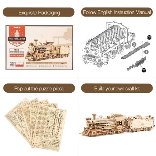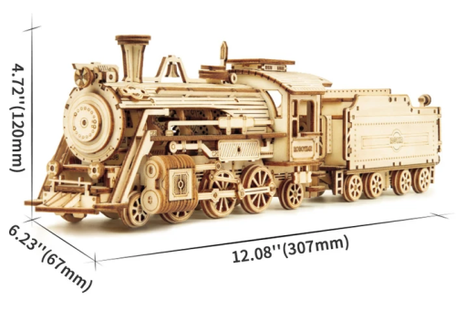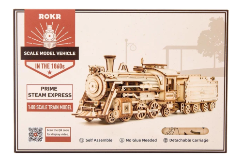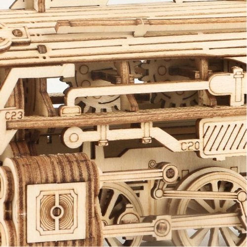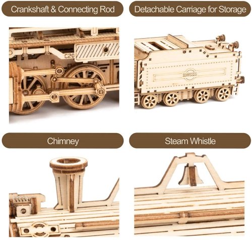 Propracovaný model parní lokomotivy v měřítku 1:80 je určen všem fanouškům techniky a období vrcholící průmyslové revoluce. Součástí stavebnice je rovněž tendr nabízející drobný úložný prostor pro upomínkové předměty, či cennosti. Sestavená miniatura je určena k vystavení a dekoraci, není proto pohyblivá. Přírodní úprava je univerzálně vhodná do každého interiéru, model však můžete přizpůsobit a nabarvit podle vlastních představ. Nezapomeňte se nám svou úpravou pochlubit! Skládačka je dodávána v krabici spolu s podrobným ilustrovaným návodem k sestavení. Hlavní vlastnosti:308 precizně vyřezaných dílkůstřední obtížnost sestavenídrobný úložný prostor
