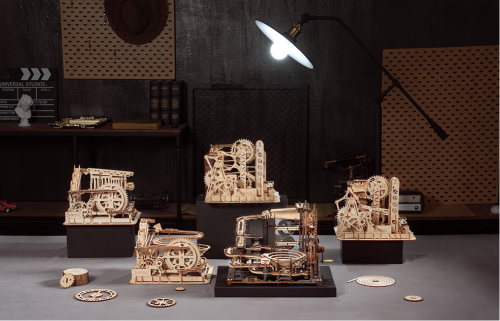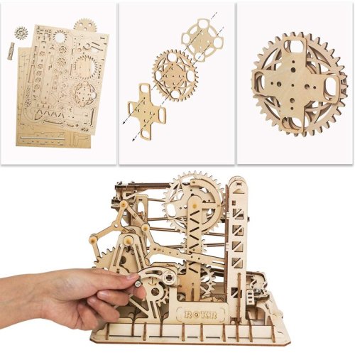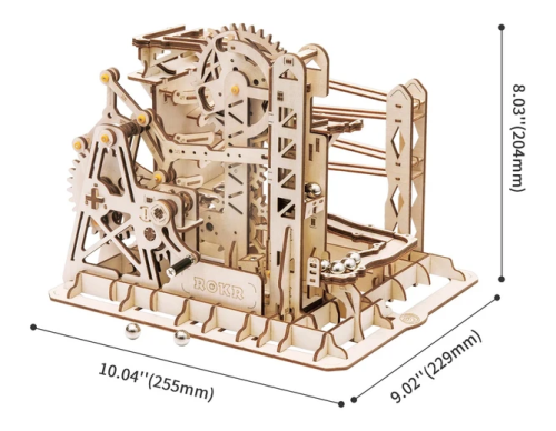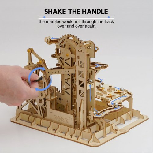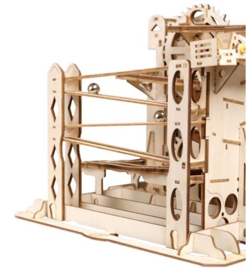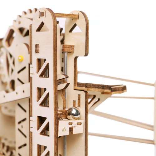Kuličková dráha s výtahem v šachtě a velkou kaskádou. Skládačky kuličkových drah Robotime nabízejí jinde nevídané podrobnosti a variabilitu. Každá se může pyšnit originálními funkčními detaily a roztodivnými překážkami, které často nápaditě změní dráhu kuličky, a přinášejí tak výjimečnou zábavu. Mechanika je poháněna ručním pohonem, otáčením klikou, kterým jsou také vynášeny a na cestu pravidelně spouštěny kuličky. Skládačka je dodávána v nesloženém stavu, balena v krabici. Vybaveno detailním návodem k sestavení. Hlavní vlastnosti:skládačka dráhy a 10 kuliček219 precizně vyřezaných dílkůstřední obtížnost sestavení
