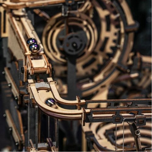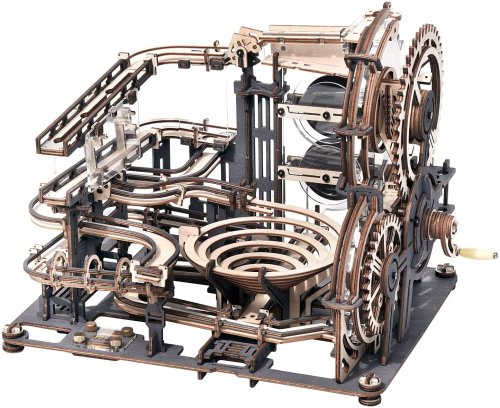 Ručně vyrobená kuličková dráha ve tvaru trychtýře o délce trati 2,5 metru. Skládá se z věžového rozvaděče, spirálových svahů, jeřábového zvedáku, kolového zvedáku, krátké skluzavky a malých spínačů. Složitý systém ozubených koleček, převodů a kol, plný bláznivých zákrut. Mechanický model s nekonečným cyklem. Naučte se principy vědy, techniky, inženýrství a matematiky (STEM). Přesně vyřezané dílky laserem. Kvalitní, bezpečné a netoxické materiály. Rozvíjí technické myšlení, představivost, cit pro detail a jemnou motoriku. Skvělý dárek pro rodinu a přátele ke všem příležitostem.