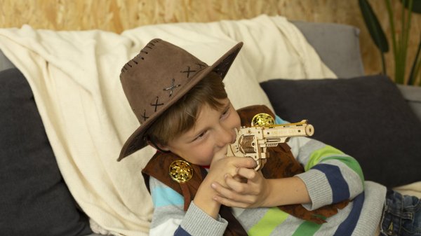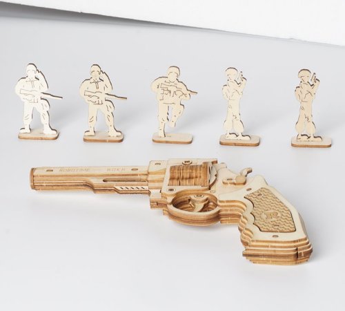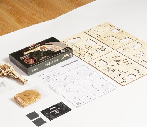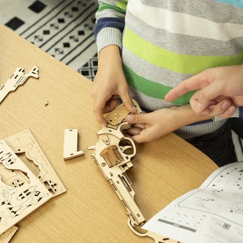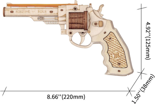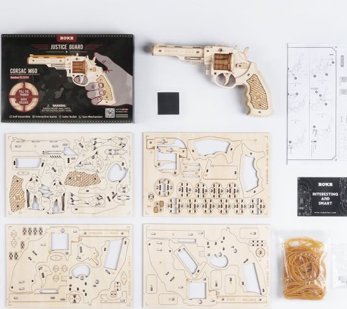 Dřevěný 3D model ROBOTIME ROKR je inspirovaný klasickou pistolí Smith +amp; Wesson Model 60 - Corsac M60 a je její dokonalou replikou v cool steampunkovém stylu. Účinný dostřel: 5m.