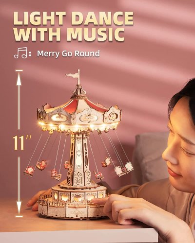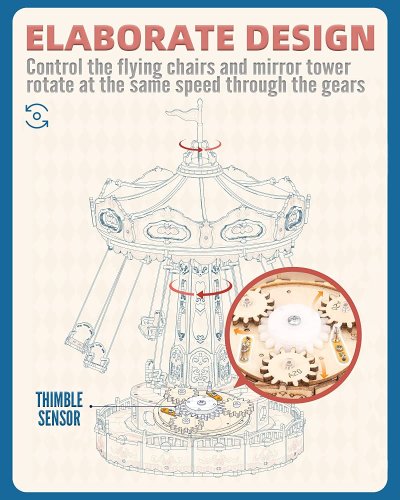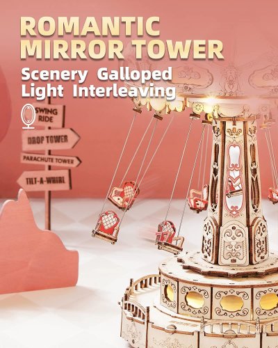 Se světly a hudbou, ovládání dotykovým senzorem (hudbu lze vypnout). Tichý motorek pohání horní část věže, která se otáčí ve směru hodinových ručiček, a současně převodový mechanismus otáčí protisměrně středovým sloupem. Spousta hodin zábavy při skládání s kouzlem mechanických převodů. Laserem předřezané dílky z kvalitní lipové překližky pro stavbu svépomocí. Rozvíjí technické myšlení, představivost, cit pro detail a jemnou motoriku. Přehledný obrázkový návod krok za krokem, včetně QR kódů pro zobrazení videonávodu. Překrásný dárek pro větší děti i dospělé, elegantní dekorace.
