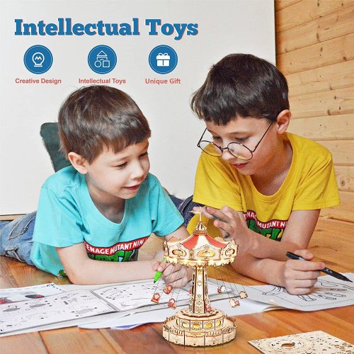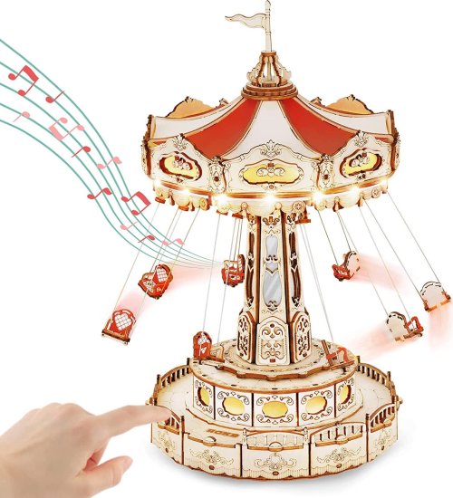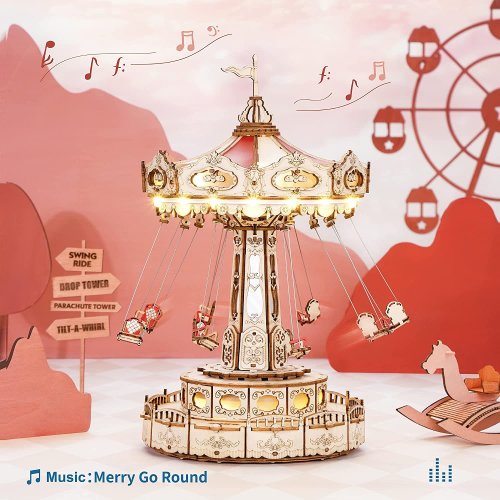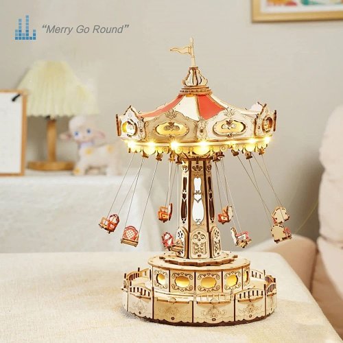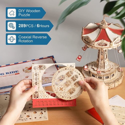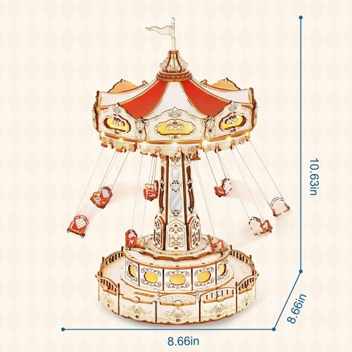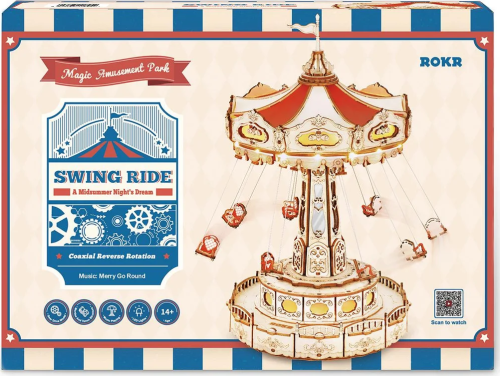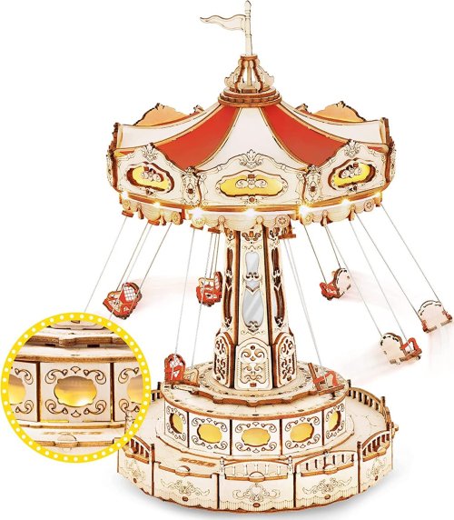 Sada dřevěného 3D puzzle k sestavení hrací skříňky ve tvaru pouťového řetízkového kolotoče ze série kouzelný zábavní park (Magic Amusement Park).