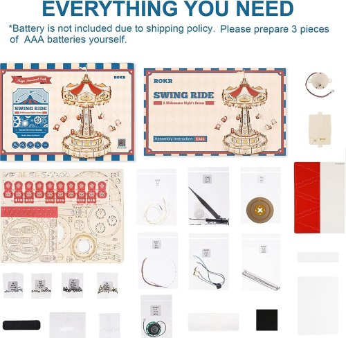 Obtížnost: 4 ze 5 (dle rozdělení Robotime). Pro provoz jsou třeba 3 ks baterie AAA (nejsou součástí balení).