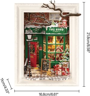 Tento půvabný miniaturní model hračkářství zobrazuje Santův oblíbený obchůdek na hlavní ulici – místo plné plyšáků, dárků a vánoční magie, které čekají, až si je někdo odnese domů. Při pohledu skrz skleněné okno 3D scény objevíte nádherně zpracované detaily ukryté v bílém rámu ve stylu stínového boxu: rozsvícenou lucernu, červené dveře obchodu, vánoční stromeček se sněhovou čepicí, zdi z červených cihel, tabulku se zázvorkovým panáčkem i krásně zabalené dárky. Obtížnost: 2 z 5 (dle rozdělení Robotime). Orientační doba na složení: 2 hodiny.
