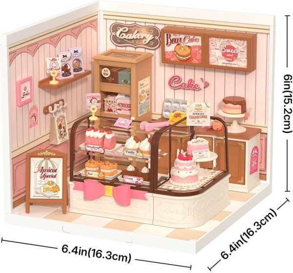Nejlepším prvkem tohoto mini domečku jsou však skleněné vitríny uprostřed pekárny. Dva pulty – jeden rovný a druhý zakřivený – představují roztomilé dortíky, zdobené cupcakes a krémové makronky s barevnými štítky. Kleště jsou připravené na cokoli, co si vyberete, a vzadu čekají další dobroty, které lze servírovat. Aby byl vizuální zážitek úplný, pastelově růžové a hnědé stěny zdobí plakáty Sweet Beara, maskota obchodu. Medvěd se objevuje také v nabídce a na taškách s sebou. Obtížnost: 1 z 5 (dle rozdělení Robotime). Orientační doba na složení: 1 hodinu.