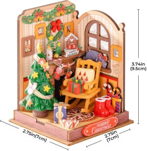 Na římse krbu visí kalendář s datem 25. prosince, kolem se třpytí girlandy, věnec, vánoční stromeček a hoří svíčka, která dotváří hřejivou atmosféru. Dědeček se usazuje do houpacího křesla, zatímco rodina poslouchá jeho vzpomínky na minulé svátky. Na stěnách visí fotografie, pod stromečkem čekají dárky a sladkosti, u okna spokojeně odpočívá kočka a vše zahaluje zimní koberec se sněhovými vločkami. Obtížnost: 1 z 5 (dle rozdělení Robotime). Orientační doba na složení: 1 hodinu.