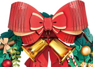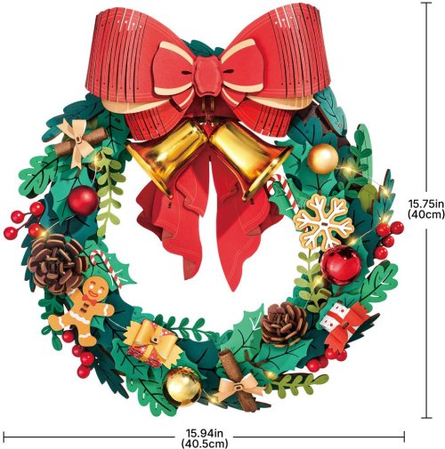 Na kruhu z jehličnatých větviček jsou rozmístěny třpytivé ozdoby, jako jsou cesmína, žaludy, sněhové vločky, bobule, perníčkoví panáčci, cukrové tyčinky a dárky. Velká červená mašle se zlatými zvonečky vytváří veselou atmosféru. Tento výrobek má dokonce i interaktivní prvek - zvonky zvoní, když s nimi zatřepete. Pro napájení LED světla jsou potřeba 2ks 1,5V baterií AAA,LR03,AM4 (nejsou součástí balení).