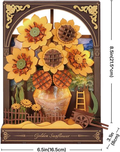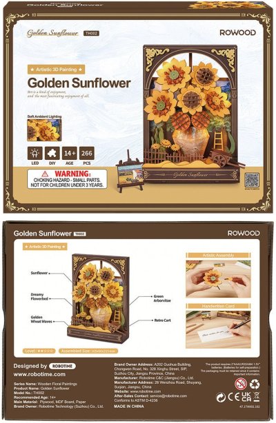 Slunečnice od Rowood je květina, která nikdy nezvadne. Jsou zároveň noční lampičkou i dekorací. Svými vrstvenými okvětními lístky, texturovanými listy a zářivými barvami vykouzlí úsměv každý den. Všechny díly skládačky jsou přesně vyřezané a očíslované a lehce do sebe zapadnou, aby výsledek byl stabilní a odolný. Skládačka je dodávána v nesloženém stavu s obrázkovým návodem k sestavení. Pro napájení LED světla je třeba 2 ks 1,5V baterií AAA,LR03,AM4 (nejsou součástí balení).