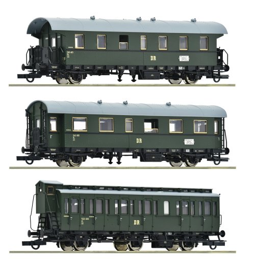 3dílná sada vedlejšího vlaku DR – Německé říšské dráhy obsahuje dva osobní vozy typu „Donnerbüchse“ a jeden 3osý oddílový vůz 2. třídy se služebním oddílem. Ideální pro doplnění H0 modelové železnice v epoše III. Vozy jsou vybaveny vnitřní výbavou a střední nápravy jsou pohyblivé, což zajišťuje plynulý chod na kolejích. Specifikace: Typ sady: 3dílná (2x osobní vůz 2. třídy, 1x 3osý oddílový vůz 2. třídy)Měřítko: H0Epocha: IIIŽelezniční společnost: DR (Deutsche Reichsbahn)Délka přes nárazníky: 466 mmSpojky: šachta NEM 362 s KK-kinematikouNapájení: DC analogVnitřní vybavení: AnoMožnost dodatečného osvětlení: Ano Hlavní vlastnosti: kompletní sada 3 vozů pro modelovou železnici H0 (dva osobní vozy 2. třídy „Donnerbüchse“, jeden 3osý oddílový vůz se služebním oddílem)střední nápravy se bočně pohybují pro lepší jízduvnitřní vybavení všech vozůmožnost dodatečného osvětleníkompatibilní s DC analog systémem Dokumentace: přiřazení registrů a funkčních kláves (DE, EN, F)