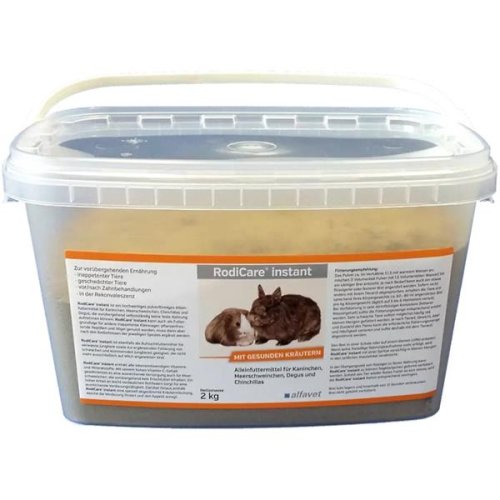 RodiCare Instant je hodnotné kompletní krmivo v práškové formě – tzv. „tekuté seno“ – určené pro zakrslé králíky, morčata, osmáky a činčily, kteří přechodně nemohou přijímat pevnou stravu. Je také vhodné k dočasné výživě zvířat s nechutenstvím, oslabených zvířat, před a po ošetření zubů a v rekonvalescenci, pro odchov osiřelých mláďat i jako doplněk krmiva u slabých a churavějících zvířat. RodiCare Instant obsahuje všechny životně důležité vitamíny a minerální látky. Díky vysokému obsahu vitamínu C zajišťuje dostatečný přísun i u morčat, která dočasně nemohou přijímat čerstvé krmivo. Vysoký podíl vlákniny podporuje střevní peristaltiku. Pektin a frukto-oligosacharidy (FOS) podporují střevní mikroflóru. Vyladěná směs bylin podporuje trávení a povzbuzuje chuť k jídlu. Složení: moučka z alpské trávy 30 %, slupky sójových bobů 25 %, lněné výlisky, ovesné otruby 10 %, pšeničné klíčky, fenykl plod 1,5 %, řepkový olej, máta 1 %, kmín plod 1 %, pektin 1 %, chlorid sodný, pískavice řecké seno 0,5 %, lékořice 0,5 %, kurkuma 0,5 %, kořen puškvorce 0,5 %, heřmánek květ 0,5 %, frukto-oligosacharidy 0,25 %. Analytické složky: hrubý protein 16 %, hrubý tuk 4,8 %, vláknina 22 %, hrubý popel 6,9 %, vápník 0,5 %. Nutriční doplňkové látky na 1 kg: vitamín A 11 400 MJ, vitamín D3 760 MJ, vitamín E 38 mg, vitamín C 9 510 mg, vitamín K3 1,9 mg, vitamín B1 1,4 mg, vitamín B2 3,8 mg, vitamín B6 3,8 mg, vitamín B12 28,5 µg, niacin 19 mg, kalcium D-pantothenát 12,8 mg, cholinchlorid 285 mg, síran železnatý monohydrát 47,5 mg, oxid manganatý 38 mg, oxid zinečnatý 57 mg, síran měďnatý pentahydrát 11,9 mg, kalciumjodát bezvodý 0,9 mg, selen (natriumselenit) 0,2 mg, potažený granulovaný bis(uhličitan) kobaltnatý 0,4 mg. Dávkování a doporučené krmení: Prášek rozmíchejte s teplou vodou přibližně v poměru 1 : 2 (1 objemový díl prášku na 2 objemové díly vody) na hladkou kaši. Podle potřeby je možné připravit kaši o něco tekutější nebo hustší. Nedoporučí-li veterinární lékař jinak, podává se 60–80 ml rozmíchané kaše na 1 kg tělesné hmotnosti denně, rozdělené do 5–6 jednotlivých krmení. Velmi slabá a nemocná zvířata by měla být krmena co možná nejčastěji (každé 2–3 hodiny) po malých dávkách. Podle druhu zvířete, hmotnosti, věku a stavu zvířete se může potřebné množství krmiva lišit a mělo by být konzultováno s veterinárním lékařem. Kaši podávejte v misce nebo na malé lžičce. Pokud zvíře nepřijímá potravu samostatně, je možné podávat RodiCare Instant opatrně po malých dávkách stříkačkou přímo do tlamičky. V období přechodu z tekuté na pevnou stravu se může RodiCare Instant podávat jako hustší těsto zformované do malých hrudek. Jakmile zvíře opět přijímá pevnou stravu, porce RodiCare Instant přiměřeně snižujte. Doporučení: Úplná regenerace zažívacího traktu může trvat i několik týdnů, proto je vhodné během přechodu na pevnou stravu a po něm podávat peletované krmivo RodiCare Basic. Upozornění: Zvířeti vždy zajistěte neomezený přístup ke kvalitnímu senu a čerstvé pitné vodě.