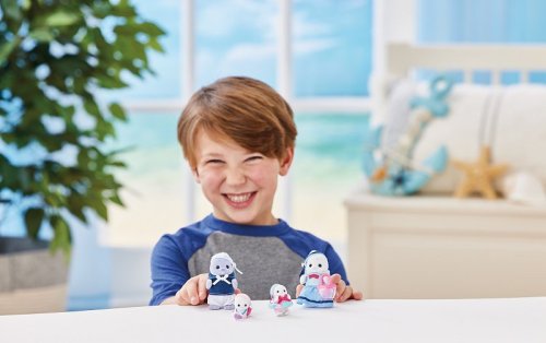 Sada Rodina tuleňů obsahuje 4 figurky roztomilých postaviček ze země Sylvanian Families. Figurky jsou pokryté sametově hebkým kožíškem a mají pohyblivé hlavičky, ručičky a nožičky. Tuleni mají roztomilé zaoblené tvary. Všichni mají stejné charakteristické vrásky nad očima, které připomínají obočí, ušní jamky a fousky. Figurky jsou oblečeny do rozkošných námořnických uniforem. Táta Maurice Floater je skvělý plavec. Kdysi měl přezdívku Mořský blesk z Cape Sea Breeze, ale teď se spíše povaluje a lenoší. Nereaguje ani na to, když ho děti šťouchají do břicha. Maminka Amory Floater je vřelá, přátelská a starostlivá. Kupuje svým dětem spoustu hraček a často říká: „Zatím to zmrazíme!" Věří, že když něco zmrazí, čas se zastaví, takže má vždycky přeplněný mrazák. Malý Puffy Floater je velmi opatrný. Když je ve vodě, nedá plavecký kruh z ruky a závistivě se dívá na svou sestru Moffy, která už umí velmi dobře plavat. Každý den trénuje plavání s tatínkem, protože už chce plavat sám! Moffy Floater je velmi aktivní. Je pravým opakem svého bratra. Rychle se naučila plavat, skáče do vody a cáká na všechny kolem. Hra s figurkami Sylvanian Families podporuje představivost. Hračky Sylvanian Families jsou známé svou prvotřídní kvalitou a pečlivým zpracováním každého detailu. Hračky Sylvanian Families doporučujeme pro děti od 3 let.