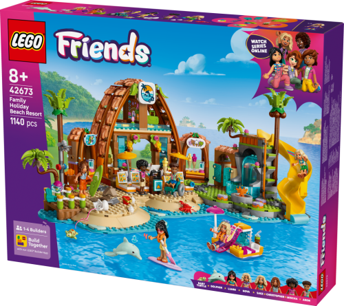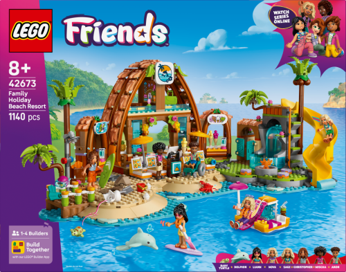 Tato stavebnice plážového resortu z kostek LEGO® představuje skvělý dárek pro děti, které si rády užívají dny na pláži a rády by si postavily model s kamarády a rodinou Inspirujte malé stavitele k dalším kreativním nápadům se stavebnicemi (prodávají se samostatně) Také online seriálem LEGO® Friends: Nová kapitola, ve kterémse děti seznámí s postavami z městečka Heartlake Aplikace LEGO® Builder nabízí zábavný stavitelský zážitek, při kterém si užijete společné stavění Stavebnice se skládá z 1140 dílků a hlavní model měří přes 18 cm na výšku, 45 cm na šířku a 24 cm do hloubky