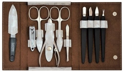 Stříbrno béžové 10dílné pouzdro z pravého semiše obsahuje nůžky na nehty, nůžky na kůžičku, kleštičky na nehty 5,5cm, kleště na nehty 10cm, šikmou pinzetu, safírový pilníček 12cm, vidličku na nehtovou kůžičku a tři jednostranné manikúrové nástroje.