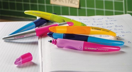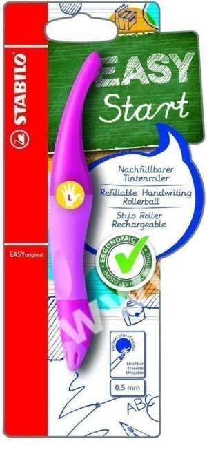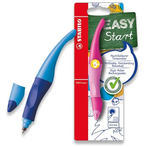 [pro leváky], * první roller v ergonomickém tvaru, ve variantě zvlášť pro leváky a praváky, * moderní alternativa plnícího pera, * tvarovaný úchop z neklouzavého materiálu, * jedinečný design, * nový hrot s každou novou náplní, velmi jednoduchá výměna, * ZMIZÍKOVATELNÝ MODRÝ INKOUST, * balení obsahuje 1 náplň a štítek na jméno, Uvolněné držení napomáhá proti předčasné únavě svalstva ruky a bolestem ruky při psaní (případné bolesti zad a hlavy). Díky kuličce v náplni lehce klouže po papíře, lehká a, komfortní manipulace. , [0,5 mm]ŠÍŘE STOPY: 0,5 mm, Náhradní náplň STABILO EASYoriginal. K vymazání inkoustové stopy doporučujeme zmizík STABILO ColorKilla., Technologie rolleru umožňuje školákům psaní bez škrábání na papíře. Nedělá kaňky, při psaní lehce klouže a i výměna náplně je zcela jednoduchá a bez špinavých rukou. , STABILO EASYoriginal intuitivním způsobem NAPOMÁHÁ SPRÁVNÉMU DRŽENÍ, je proto VHODNÝ JAK PRO ZAČÍNAJÍCÍ DĚTI, TAK I PRO STARŠÍ ŠKOLÁKY. Jeho úchopová zóna je vytvarovaná, zvlášť PRO PRAVÁKY a PRO LEVÁKY. , Školákům, kteří se psaním začínají a potřebuji širší stopu, je určena náplň s šíří stopy Medium (0,5 mm). Pokud by stopa byla tenká, začali by na psací potřebu tlačit, a tím, se zbytečně stresovali. Dokoupit je možné i náplň s užší šířkou stopy Fine (0,3 mm), která je doporučována starším školákům zhruba od 3. třídy.