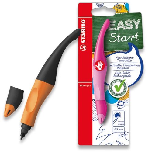 [pro praváky], * první roller v ergonomickém tvaru, ve variantě zvlášť pro leváky a praváky, * moderní alternativa plnícího pera, * tvarovaný úchop z neklouzavého materiálu, * jedinečný design, * nový hrot s každou novou náplní, velmi jednoduchá výměna, * ZMIZÍKOVATELNÝ MODRÝ INKOUST, * balení obsahuje 1 náplň a štítek na jméno, Uvolněné držení napomáhá proti předčasné únavě svalstva ruky a bolestem ruky při psaní (případné bolesti zad a hlavy). Díky kuličce v náplni lehce klouže po papíře, lehká a, komfortní manipulace. , [0,5 mm]šíře stopy 0,5 mm, Náhradní náplň STABILO EASYoriginal. K vymazání inkoustové stopy doporučujeme zmizík STABILO ColorKilla., Technologie rolleru umožňuje školákům psaní bez škrábání na papíře. Nedělá kaňky, při psaní lehce klouže a i výměna náplně je zcela jednoduchá a bez špinavých rukou. , STABILO EASYoriginal intuitivním způsobem NAPOMÁHÁ SPRÁVNÉMU DRŽENÍ, je proto VHODNÝ JAK PRO ZAČÍNAJÍCÍ DĚTI, TAK I PRO STARŠÍ ŠKOLÁKY. Jeho úchopová zóna je vytvarovaná, zvlášť PRO PRAVÁKY a PRO LEVÁKY. , Školákům, kteří se psaním začínají a potřebuji širší stopu, je určena náplň s šíří stopy Medium (0,5 mm). Pokud by stopa byla tenká, začali by na psací potřebu tlačit, a tím, se zbytečně stresovali. Dokoupit je možné i náplň s užší šířkou stopy Fine (0,3 mm), která je doporučována starším školákům zhruba od 3. třídy.