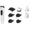 Materiál čepelí: nerezová ocel Rychlost motoru: 6500 ot/min Nastavení rychlosti: 1 Minimální délka zastřižení: 1 mm Ukazatel délky zastřižení: kombinovaný Oblasti zastřižení: vlasy + vousy + uši a nos Čepel na zastřihování vlasů Šířka čepele na zastřihování vlasů: 44 mm Typ nástavce na vlasy: pevný Počet nástavců na vlasy: 4 Rozsah nastavení délky sestřihu vlasů: 1-12 mm Čepel na zastřihování vousů Šířka čepele na zastřihování vousů: 32 mm Rozsah nastavení délky zastřižení vousů: 1-7 mm Početnastavení délky zastřižení vousů: 7 Planžetový holicí strojek mini Zastřihovač chloupků v uších a nosu Provozní doba: až 60 min Čas dobíjení: 8 h Použití: bezšňůrové + šňůrové Typ baterie: NiMh Odnímatelná holicí hlava Čištění: omyvatelná hlava Další příslušenství: olejnička + kartáček Ukazatel nabití: LED Barva: bílá a černá Napětí: 100-240 V