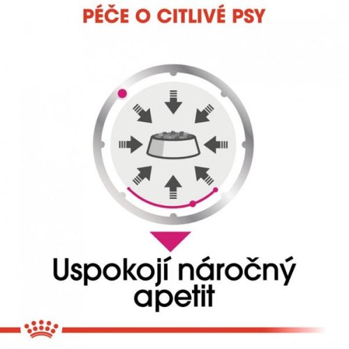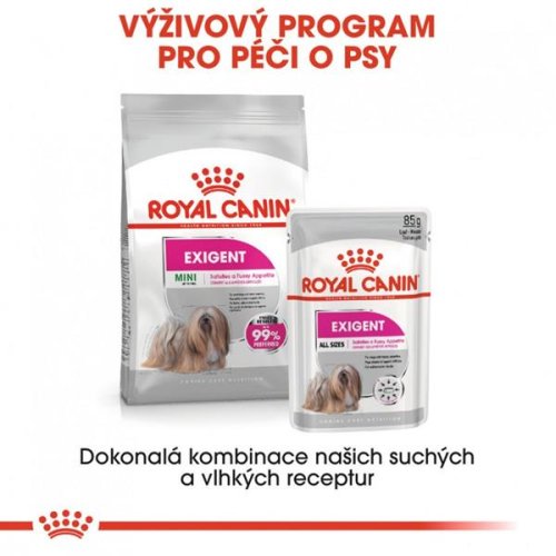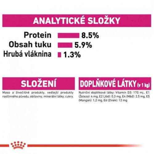 Věděli jste, že váš pes má skvěle vyvinutou chuť? Při jídle pes posuzuje nejen konzistenci, ale také vůni a velikost sousta svého pokrmu. Pokud je váš pes vybíravý, můžete jeho chuť k jídlu uspokojit lahodnou a kompletní stravou, kterou nejen sní, ale také si ji vychutná. Kapsička v paštice ROYAL CANIN® Exigent Loaf je vhodná pro psy všech velikostí, je plná živin, které váš pes potřebuje pro zdravý život. Díky tomuto lahodnému krmivu, které zbožňují i ti nejvybíravější psi, bude váš pes jíst zdravě. Bohatá paštika je vařena přímo v kapsičce, aby byla zachována veškerá její vůně. Vysoce kvalitní živiny zajišťují chuť a konzistenci, kterým váš pes neodolá. Veškerá krmiva Royal Canin jsou nutričně kompletní a obsahují 100 % kvalitních bílkovin, tuků, vlákniny, vitamínů a minerálů, které váš pes potřebuje pro celoživotní tělesnou a duševní pohodu. Složení: Maso a živočišné produkty, vedlejší produkty rostlinného původu, obiloviny, minerální látky, cukry. Nutriční doplňkové látky: Vitamín D3: 170 mj., E1 (Železo): 4 mg, E2 (Jód): 0,3 mg, E4 (Měď): 2,5 mg, E5 (Mangan): 1,2 mg, E6 (Zinek): 12 mg. Analytické složky: Protein: 8,5 %, obsah tuku: 5,9 %, hrubý popel: 1,7 %, hrubá vláknina: 1,3 %, vlhkost: 79,5 %.