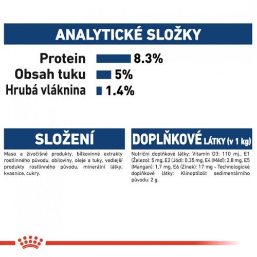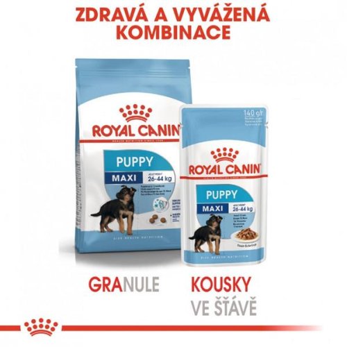 Růst je důležitou fází v životě vašeho psa: je to období změn a objevů. Velká štěňata potřebují kompletní a vyváženou stravu obsahující specifické živiny, které při růstu podporují jejich zdraví. Složení kapsičky pro velká štěňata ROYAL CANIN® Maxi Puppy in Gravy je vytvořeno tak, aby uspokojovalo veškeré nutriční potřeby velkých štěňat mladších 15 měsíců, která budou v dospělosti vážit mezi 26 a 44 kg. Aby mohlo podporovat přirozenou obranyschopnost vašeho štěněte během růstu, kapsička pro velká štěňata ROYAL CANIN® Maxi Puppy in Gravy obsahuje exkluzivní komplex antioxidantů, včetně vitamínu E, který podporuje vyvíjející se imunitní systém vašeho štěněte. Vysoce stravitelná bílkovina a prebiotika v kapsičce podporují správnou funkci trávicího systému a zdravou rovnováhu střevní mikroflóry, které společně vedou ke kvalitní stolici. Různé velikosti a plemena psů mají různé energetické nároky. Krmivo ROYAL CANIN® Maxi Puppy in Gravy obsahuje střední obsah energie, který uspokojuje střední energetické nároky štěňat velkých plemen. Složení: Maso a živočišné produkty, bílkovinné extrakty rostlinného původu, obiloviny, oleje a tuky, vedlejší produkty rostlinného původu, minerální látky, kvasnice, cukry. Nutriční doplňkové látky: Vitamín D3: 110 mj., E1 (Železo): 5 mg, E2 (Jód): 0,35 mg, E4 (Měď): 2,8 mg, E5 (Mangan): 1,7 mg, E6 (Zinek): 17 mg. Technologické doplňkové látky: Klinoptilolit sedimentárního původu: 2 g. Analytické složky: Protein: 8,3 %, obsah tuku: 5 %, hrubý popel: 2,2 %, hrubá vláknina: 1,4 %, vlhkost: 79,5 %, vitamín E: 150 mg/kg.