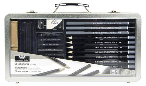 Sada obsahuje: 20 listů papíru na skicování, 9 x grafitová tužka, 6 x skicovací tyčinky, 4 x uhlík "Vine", 3 x uhlíková tužka, 3 x uhlíkové tyčinky, 1 x míchací pařez, 1x brusný blok, 1 x guma, 1 x ořezávátko, 1 x návod, 1 x plechový kufřík