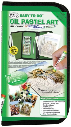 12 olejových pastelů, 6 předtištěných obrázků (papoušci, gorily, pandy, sloni, medvídci, leopardi), 1 papírová tyčinka na roztírání (délka: 12,5 cm).
