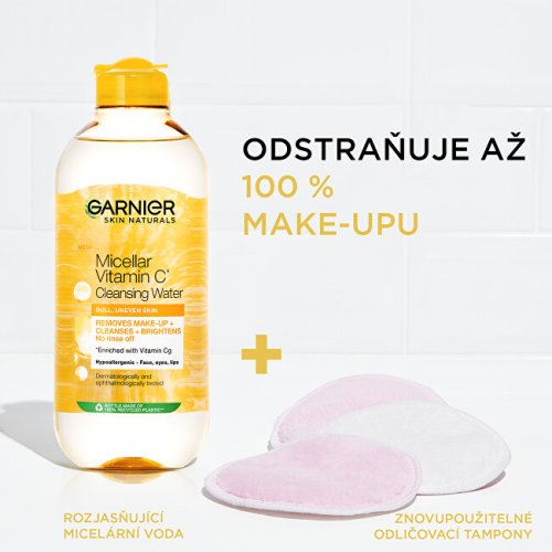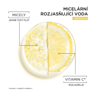 Micelární voda s vitamínem C představuje velmi jednoduchý způsob odlíčení, odstranění nečistot, rozjasnění a sjednocení pleti jedním tahem bez oplachování. Obohacená o rozjasňující vitamín C známý pro své povzbuzující účinky na mdlé a nesjednocené pleti. Obsahuje micely, které přitáhnou nečistoty jako magnet a bez tření je odstraní spolu s make-upem.
