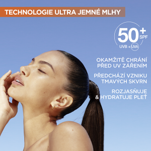Ochranná a rozjasňující mlha s SPF 50+, navržená k použití přes make-up i na čistou pleť. Je obohacena o vitamín C (derivát vitamínu C) a vitamín E, poskytuje vysokou ochranu před UV zářením a zároveň pomáhá rozjasnit pleť a předcházet vzniku tmavých skvrn způsobených sluncem. Její lehké, neviditelné složení nezanechává mastný film a je ideální pro každodenní použití.