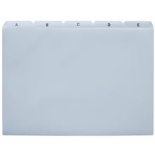 Dělicí listy do kartoték vyrobené ze silného plastu, s černým potiskem Rejstřík: A - Z (25 kusů), ohebný Formát: A4 na šířku Barva: šedá Tloušťka: 250 mic Rozměry: 22,5 x 29,7 cm