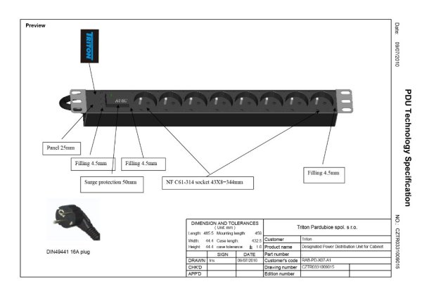 19" rozvodný panel Triton je vybavený 8 zásuvkami