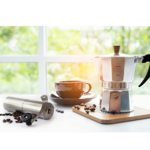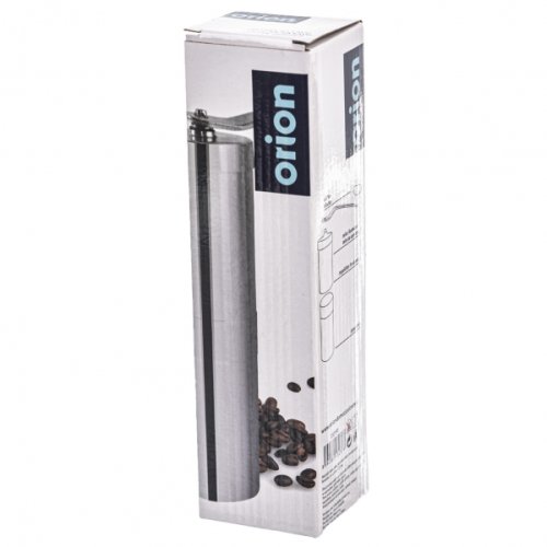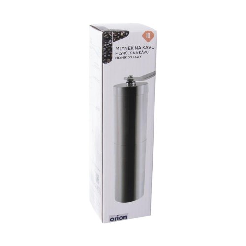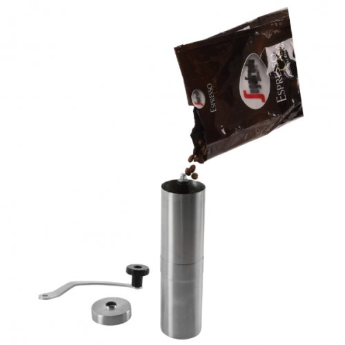 Ruční mlýnek na kávu moderního tvaru čerstvě namele zrnkovou kávu.
