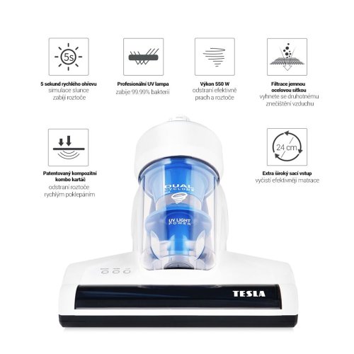 TESLA LifeStar UV550 si při čištění poradí s hluboko usazeným prachem, zvířecími chlupy a jinými nečistotami. Výkonná UV-C lampa a horký vzduch zničí 99.9% bakterií, alergenů a roztočů, sterilizuje matrace, polštáře, čalounění, snižuje riziko vzniku astmatu a kožních onemocnění. Rotační turbo kartáč pronikne hluboko do vláken textilu a efektivně odstraní nežádoucí mikroorganismy.