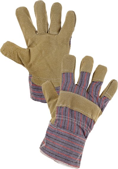 Ochranné zimní pracovní rukavice kategorie CE I. ze žluté hovězí štípenky, hřbet a manžeta z pruhované bavlněné tkaniny s podšívkou z akryl. plyše.