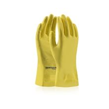 Latexové, úklidové rukavice pro domácnost Velurová úprava vnitřního povrchu Protiskluzové struktury na dlani a prstech Délka: 30 cm Množství v originálním balení 12 párů EN 420