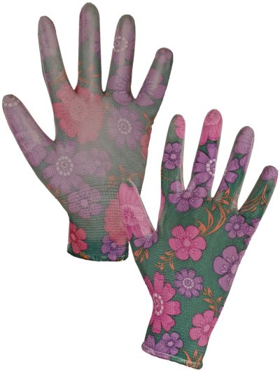 Pletené bezešvé rukavice s potiskem, dlaně a prsty povrsteny polyuretanem, pružná manžeta. Baleny s blistrem. Vhodné na zahradu, hobby, zemědělství a lehké montáže.