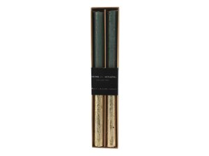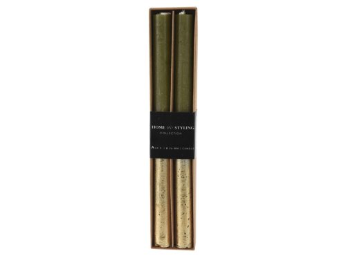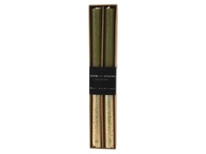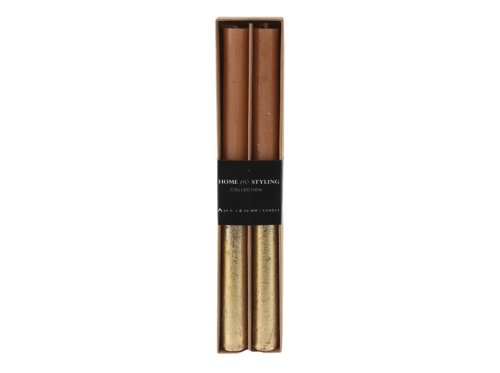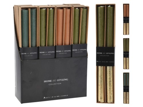 Rustikální kónické svíčky s jemným metalickým leskem dodají slavnostní atmosféru každému interiéru. Balení obsahuje 2 ks dlouhých svíček o rozměrech 21x250 mm. Vhodné do klasických svícnů, pro sváteční tabuli nebo jako součást dárkového balíčku. Mix elegantních barev.