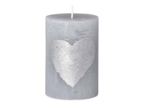 Elegantní rustikální válec svíčka v šedé barvě s lakovaným srdíčkem, ideální pro příjemné večerní chvilky. Její rozměry jsou 70 x 100 mm.