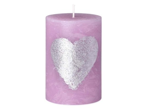 Rustikální válec svíčka v jemné fialové barvě s lakovaným srdíčkem pro romantickou atmosféru. Její rozměry jsou 70 x 100 mm.