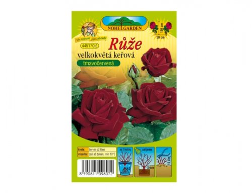 Růže velkokvětá keřová tmavě červená. Výsadba ven: září-duben. Délka sponu: 50 cm. Doba kvetení: červen-říjen. Výška rostliny: 120 cm.